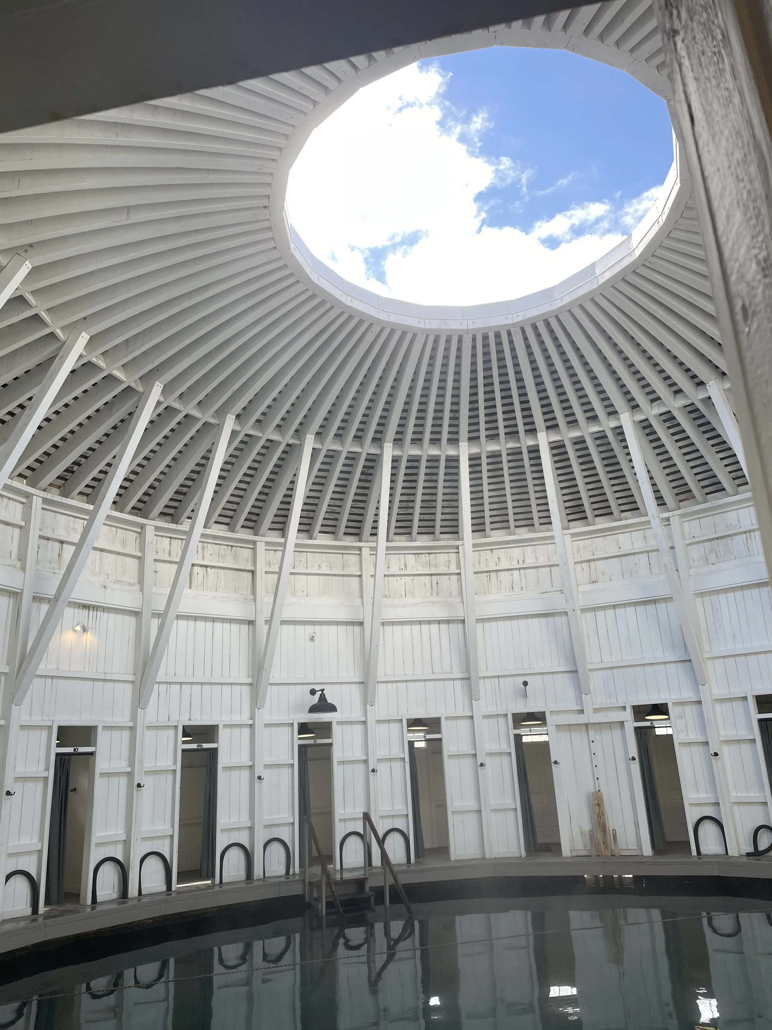 A second structure, the Ladies’ Bath House, was built in the mid-1870s. The twenty-two-sided central portion stands on a circular stone wall that encloses the spring and pool. The top plate carries a faceted roof in which wooden rafters rise to support a central frame surrounding an oculus. Visitors of the natural springs will love floating and looking up through the oculus and relaxing during their 50-minute soak.